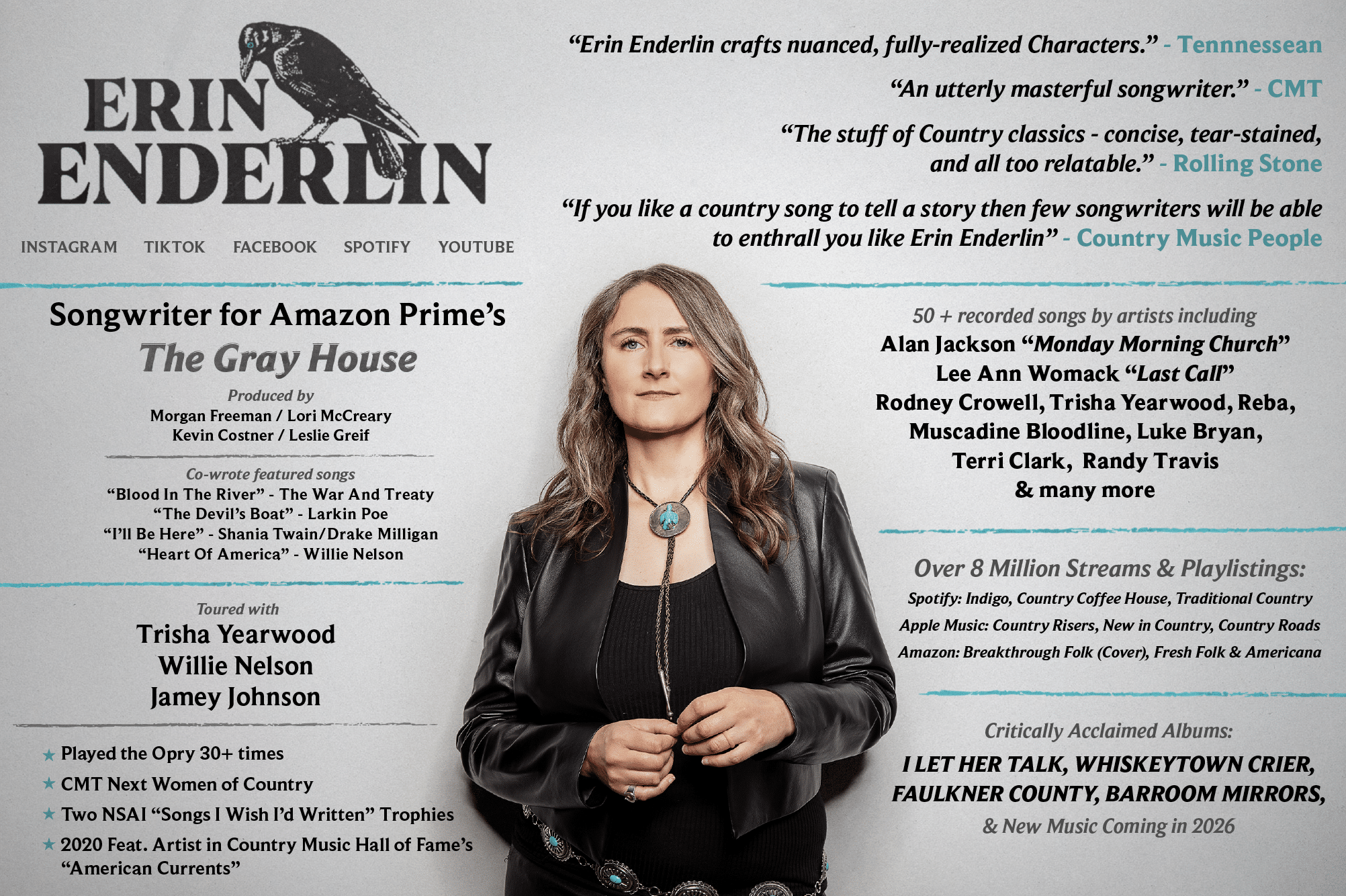 Her storytelling has earned admiration from icons and institutions alike. Elton John spotlighted her on his Rocket Hour show, calling her “a brand new country artist I absolutely love,” and the Country Music Hall of Fame & Museum featured her in its American Currents exhibit as a breakthrough artist. A regular on the Grand Ole Opry (30 appearances and counting) Enderlin has also seen more than 50 of her songs recorded by artists including Lee Ann Womack, Reba, Willie Nelson, Luke Bryan, and The War And Treaty. She recently stepped into film and TV as well, co-writing “Blood in the River” and three additional songs for The Gray House, an upcoming 2026 Amazon Prime series produced by Morgan Freeman and Kevin Costner.